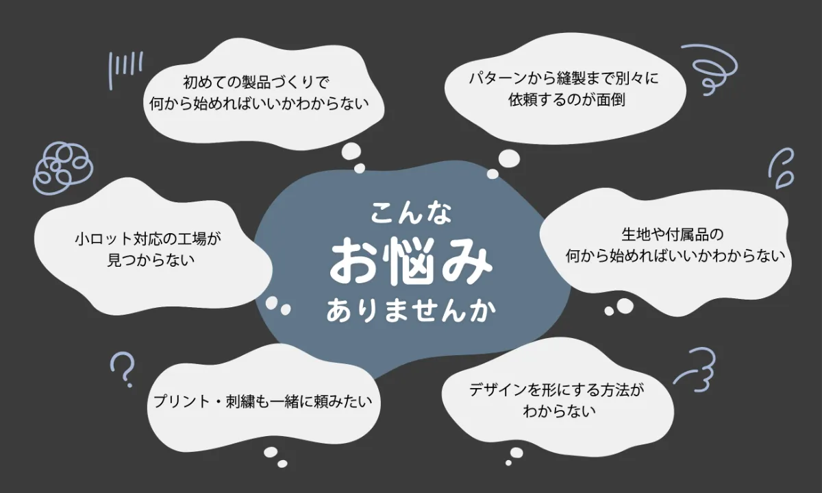 あなたに寄り添う製品づくり当社では、パターン・グレーディング・サンプル縫製はもちろん、生地や付属品の手配、プリント・刺繍などの二次加工まで、すべてワンストップで承ります。小ロット5枚から量産縫製まで対応可能ですので、「まずは少量から試したい」という方も、「本格的に生産したい」という方も、安心してご相談ください。初めての製品づくりでも、経験豊富なスタッフが丁寧にサポートいたします。